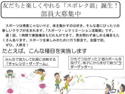 部活動に所属していない生徒や木曜日に活動が可能な生徒を対象に募集しています。入部に関するご質問は学校までご連絡ください。スポレク部の申込み期日を5月20日(月)としていますが、期日を過ぎても受付けます。右側の入部届と種目の紹介をよくご覧いただき、入部していただきますようよろしくお願いいたします。