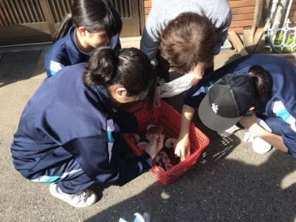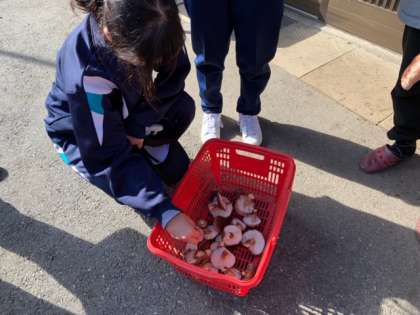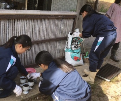 4組根羽村で、モロッコインゲンの苗植えと、夜のバーベキュー用のシイタケ採りの様子です。