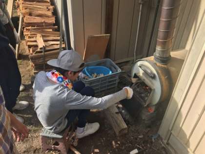 3組薪で風呂をたく体験をしています。