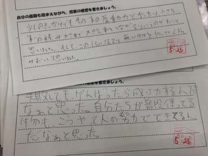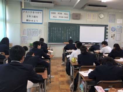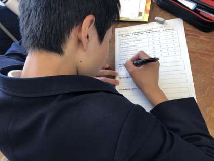 理科の授業で体のつくりを学んでいることや、社会で工業について学んでいることと繋げていきました。また、戦争のことや、昨日の綱引き大会で最後にみんなで写真を撮ったことも、資料と相入れる部分があったように思います。テスト期間ですが、みんな集中して、深い学びができていました。