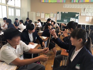 2人1組になり、刺激を伝えたり反応したりするしくみについて、実験を行いました。