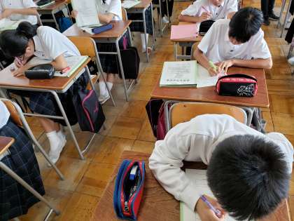 6時間目の総合で、中間テストの反省をしています。次の期末テストに向け、どのように勉強方法を改善していくのがいいか、一生懸命考えています。