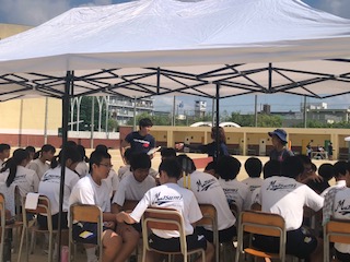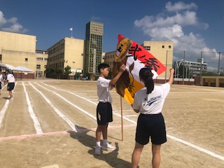 天気に恵まれ、予行練習を始めることができます。昨日の放課後、部活の生徒が協力してテントを用意しました。