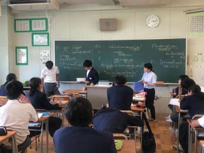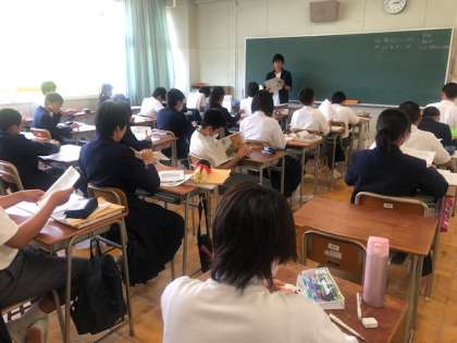 6時限目まで、頑張っている生徒の姿を見て、うれしく思います。2年生の音楽はやる気がすごくて歌声も美しかったです。今はリコーダの練習です。1年生の英語の読みのテストです。社会はチャレンジテストの学習をしていました。