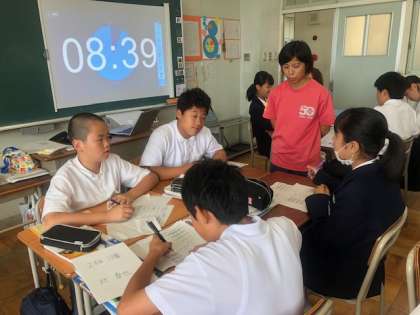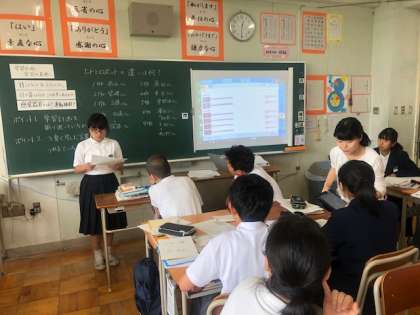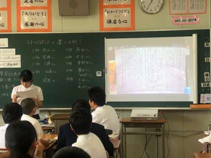 単元、動物の生活と体のつくりで、ヒトとロボットの違いについて、考えを作文し、それを4人1組で、得点つけ、一番高い得点の人の作文を発表する授業です。作文はタブレットのカメラで撮影して、プロジェクターで映しています。全員参加型で、目的がはっきりしていて楽しく学んでいました。明日も研究授業をしますお楽しみに。