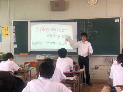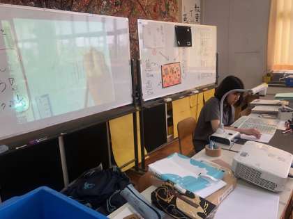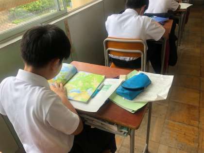 美術では先生がデッサンしているところを書画カメラとプロジェクターで映して、それを生徒たちが参考にして、自分の作品を完成しています。英語はプロジェクターでよりわかりやすく、社会は地図を読み取って、ワークに色鉛筆で塗っていました。テスト前で集中しています