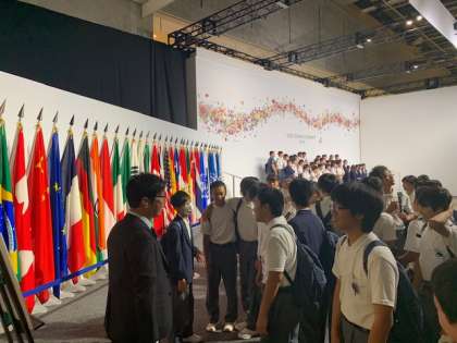 3年生は、朝から南港にあるインテックス大阪にあるG20会場の見学をしました?トランプ大統領が座った席に座ることができて、生徒たちはいい経験になったし思います。