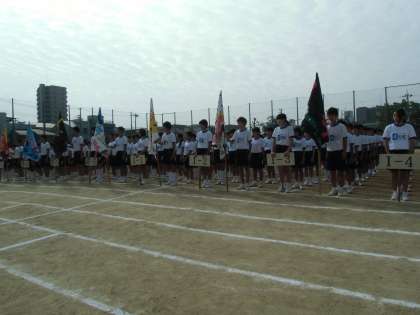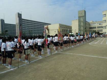 さわやかな秋晴れの下、大阪市立真住中学校第22回体育大会が開会しました。下の写真は開会式の様子です。
