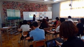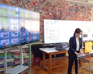 研究授業のあとは、スカイ株式会社の方から、タブレット端末を使った授業づくりについて研修していただきました。