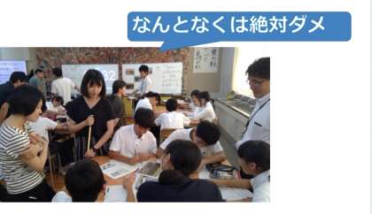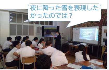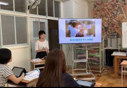 生徒の活動を振り返りながら、今日の授業で活用したタブレットの機能や、先生が準備していたことについても研修がありました。また今後の教育活動に活かしていきます。
