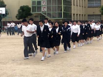 今回は火災を想定した避難訓練です。避難の際の2つの大切なことは、先生の話をしっかり聞くこと、落ち着いて行動をすることです。