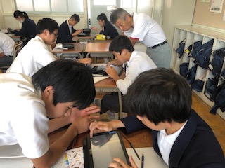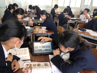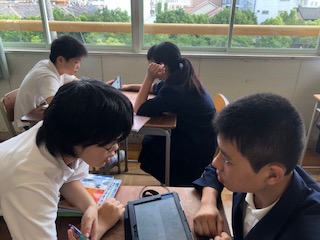 教科書で学んだことを生かして、3組もスライドを作り始めました。今日は理科Tの授業で、分からないことはすぐ相談できます。