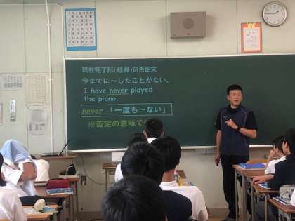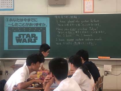 ベテランの先生の授業ですね。トークによる生徒との対話がなかなかテンポよく流れていました。have+過去分詞の文法の学習を、パワポをそのまま黒板に写すという工夫を取り入れた主体的学びで、生徒に何を学ぶのかをしっかり示されていました。
