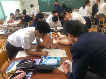 先生と生徒全員とでテンポよく対話的な学びで、文法の難しい内容が楽しく展開されました。そのあとグループになり、2つのアクティビティが展開され、1つ目にモニターに写る絵を見て、仲間との対話の中で英語で表現をする「思考の揺さぶり」を生み出し、2つ目に学びの確かめで、仲間同士でインタビューをしていました。最後までテンポのいい、なかなか面白く楽しい授業でした。