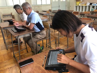 ICT担当の倉橋先生を中心に、学習教材タブレットドリルの研修を行っています。
