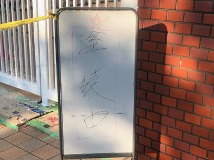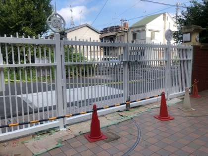 大変暑い中、生徒たちの少ない夏休みに、管理作業員のお二人にお願いして、正門を真っ白に塗りっていただいています。いままで、塗料が剥げたり、灰色になっていました。学校のイメージアップの取組の一つとして、頑張っていただいてます。熱中症には気をつけてもらっています。皆さまもペンキ塗りたてですので、気をつけてください。
