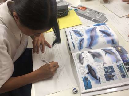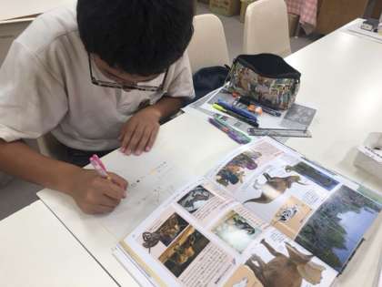 今日は博物館のガイドマップを見ながら、何をよく知りたいかを考え、ナウマンゾウや、ナガスクジラ、外来種、里山、トリケラトプスなど、一人ひとり違うことを調べていました。