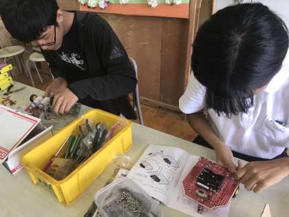 小さな部品があるにもかかわらず、上手に素早く組み立てられています。8月23日(金)9時30分より小学校と中学校の教員の研修会に、生徒たちが作成したロボットを使います。ありがとう。感謝です。