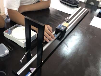 さまざまな質量の球体を使って、木片に衝撃を与えることで、木片が何cm動くかを考えています。班で「球体が速い方が動いてるんちゃう?」と対話しながら進めています。