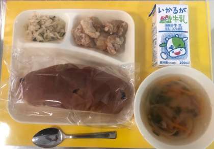今日は、パン、牛乳、鶏肉の唐揚げ、冬瓜の中華スープ、切り干し大根のごま辛みづけ 残食なし残さず食べてます。