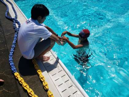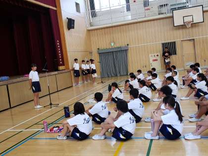 体育委員の司会進行で水泳大会がはじまりました。朝から晴天でプール日和。気持ちよかったです。水中ムカデ競争、ニコニコ楽しそうな笑顔があふれていました。碁石拾いでは担任の先生との連携プレーで頑張りました。どのクラスも2個差の接戦でした。