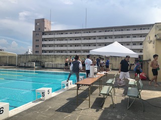 宣誓を終え、プールへ移動し、シャワーを浴びたところで雷が鳴り始めました。雷が鳴ると、屋外での活動は中止になります。したがって水泳大会も同様の対応となりました。