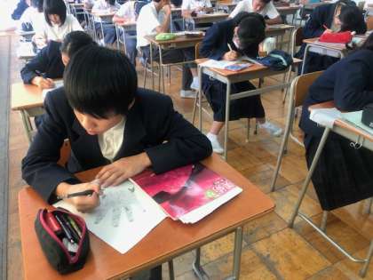 2年理科はビデオ映像を介した学習、英語はデジタル教科書でグループトーク、3年美術は総文祭に出展する手のデッサンを黙々と取り組んでいます。生徒たち頑張っています。