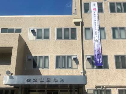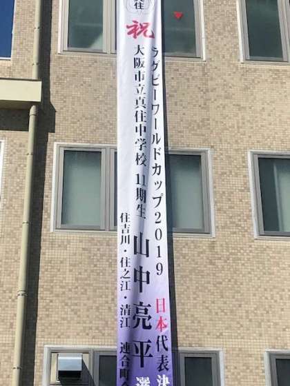 住吉川、住之江、清江連合町会の皆様が、住之江区役所ひ懸垂幕をつけて、ラグビーワールドカップ日本代表に決定した山中亮平選手を応援していただいています。地域の熱い想いに感謝しています。