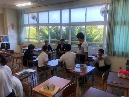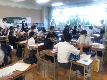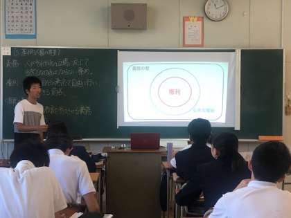 内容は憲法の権利と義務で、ICTを使ってわかりやすい説明で主体的な学びを導いた後、青果店お営むAさんと道路建設を計画しているB市の役人さんの立場にたって、道路建設に賛成反対の立場で考え、教室を左右に分けてディベートに近い形の討論をしました。将来このような対立を和解させるような仕事をしている生徒がこの中にもいるかもしれませんね。