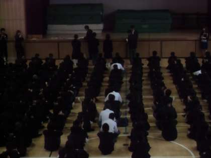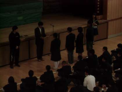 本日、雨天や休校等々の関係でなかなかできなかった全校集会があり、後期の生徒会の役員と学級役員の認証式が行われました。また、夏から秋にかけての部活動の賞状伝達も行われました。夏の大会でラグビー部が、中学校文化連盟合唱祭で吹奏楽部が、大阪市の秋季総合体育大会で陸上部がそれぞれ表彰をうけました。今後の努力に期待します。