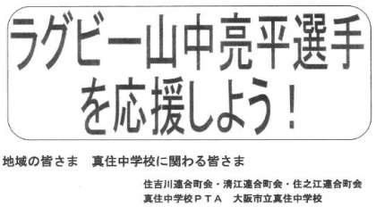 住吉川・清江・住之江連合町会が企画し、PTAと学校が協力して、真住中学校の多目的室でラグビー日本代表対アイルランド代表戦を観戦するために、、真住中学校多目的室ファンゾーンを開設して一緒に山中選手を応援する企画をしていただいています。真住中学校の関係者の皆様一緒に応援しませんか。当日は正門よりお入りください。