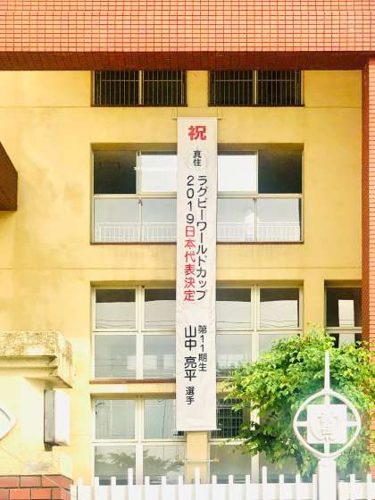 区役所に学校にも懸垂幕をつけました。これで応援体制は整いました。10月5日(土)19時30分キックオフの日本代表対サモア戦を全力で、日本代表と山中亮平選手を応援しましょう!