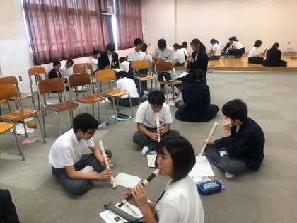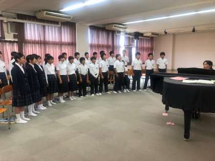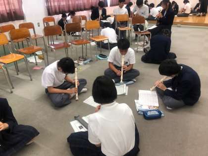 素晴らしい歌声が響き渡っていた1年生の合唱の練習と、3年生がグループでアルトリコーダーの学習をしています。学び合う授業はいいですね。
