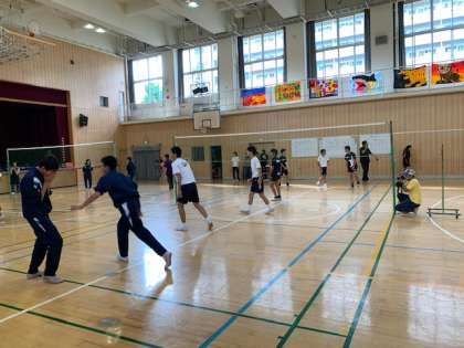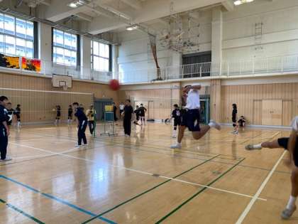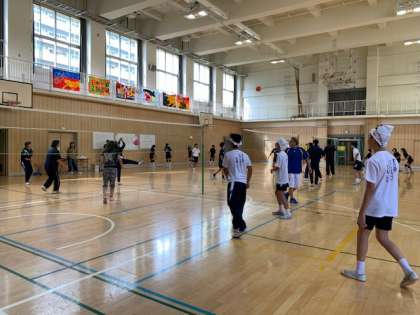 体育館はソフトバレー大会です。生徒たちがチームを組み参加申し込みをしています。元気よく頑張っています。