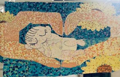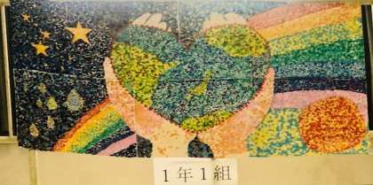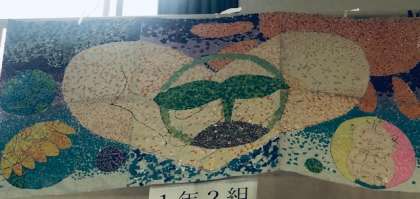 1年 ちぎり絵「生きる」です。舞台発表に合わせて色紙をちぎって一生懸命協力しながら作成していました。