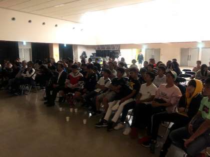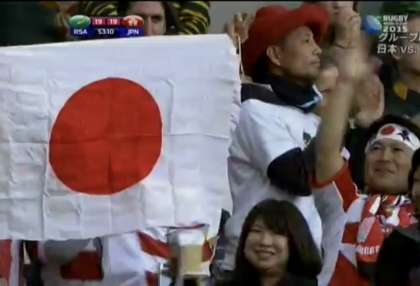 区役所区民ホールで130名の皆さまと応援しました。日本代表は大健闘を見せ前半3対5で折り返すが、さすがの南アフリカは、日本代表の分析を徹底し弱みを攻め続け、後半は0対21、3対26で4週間続いた激戦が終わりました。日本代表は全てを出し切りました。その姿に会場は、いつまでも惜しまない拍手を送っていました。