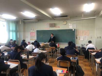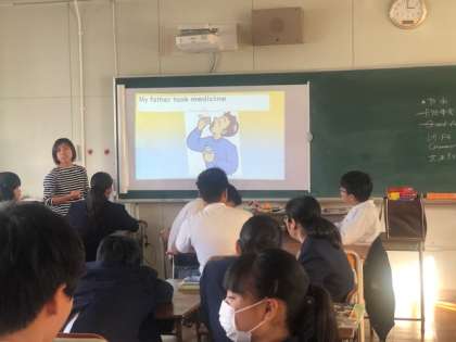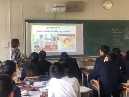 英語の授業はICTを使ってわかりやすくBecause接続詞の学習をしています。社会は江戸幕府の時代の内容でした。生徒たちは元気に学習をしていました。