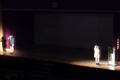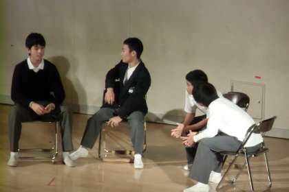 3年による劇の様子です。いじめの本質、クラスづくりについて深く考えさせられる内容を映像を活用しながら、また、体育館全体を使いながら、ユーモアもまじえて演じていました。さすが、3年生と感じさせてくれました。