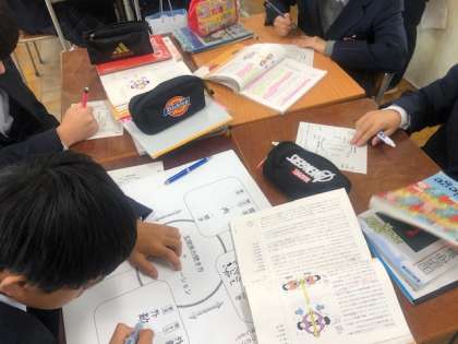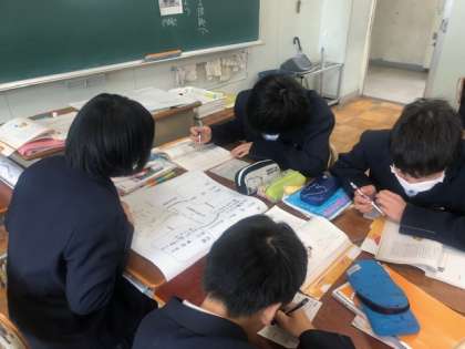 玄関扉が外側に開く場合と、内側に開く場合では、何にメリットがあるのかをグループで討論し、考えをまとめて発表する授業でした。面白い授業で、1年生の生徒がグループワークの授業を普通にできていることを嬉しく感じました。