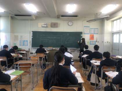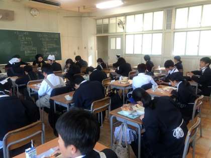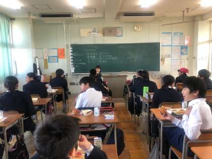 今日の給食は焼きそば、きゅうり、りんご、パンでした。美味しそうに食べていました。数学は定規と分度器を使った作図の練習をしていました。