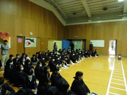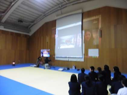 タイ王国首都バンコクにあるピチャヤ・スサカ学校との交流授業をしました。2年生全員が格技室に集まり、インターネット回線で授業をしました。映像や音響に少し課題はありましたが、実行委員の生徒たちが夏休みから準備してきたことが実現できました。それぞれ英語で会話をして、意見を交流したりしました。