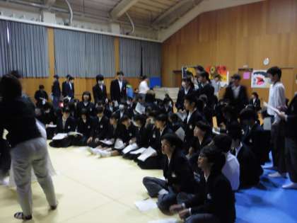 タイとSkypeで剣道と柔道の紹介を生徒たちが披露し、タイの子どもたちはタイの大きな楽器の演奏でお返しをしてくれました。そのあと、百マス計算大会を全員で行い盛り上がりました。これから、ICTを使った交流や将来的に離れた場所との会議など、生徒たちがこれからグローバル化の中で生きるためにいい経験になったと思います。