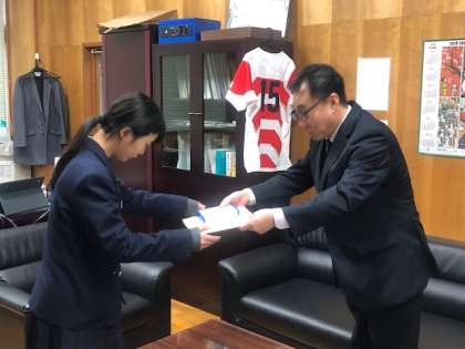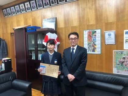 3年生女子が住吉税務署の税の作文で優秀賞をとり校長室で表彰式をしました。作文の内容も素晴らしくたくさん住吉税務署の所長さまにお褒めの言葉をいただきました。