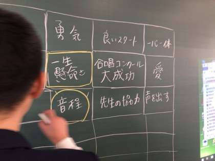 3組では、マンダラートというワークショップを行い、「自分たちの合唱コンクールを大成功させるためには」というテーマで、目標や大切にしたい想い、必要な存在について整理していきました。