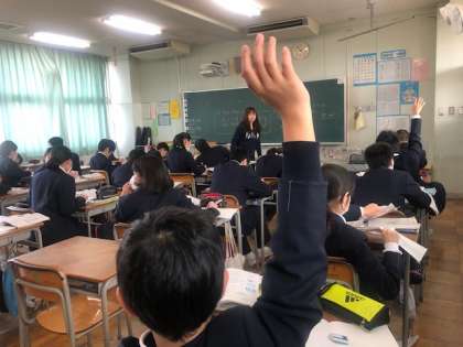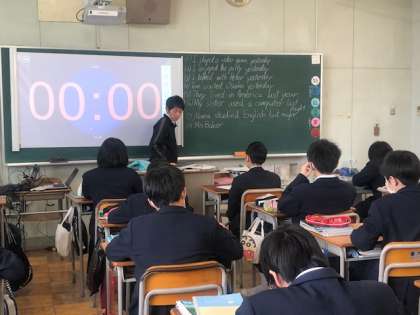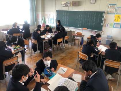 数学は立体図形の面積をグループで考えて答えを発表しています。国語は「夏の日の思い出」の内容をグループで深め、発表の準備をしています。英語は過去形の文法の学習をしています。