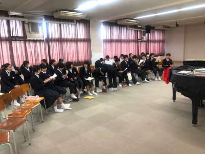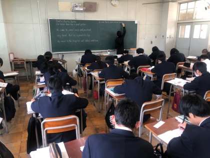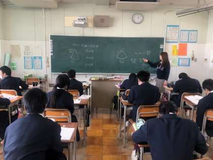 音楽は卒業式の歌「ほたるの光」を練習しています。数学は立体図形「円すい」の面積の学習、英語は過去形の文法の学習をしています。
