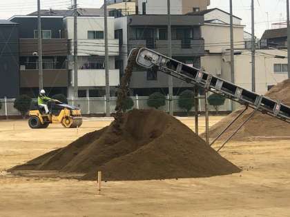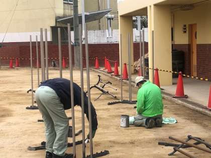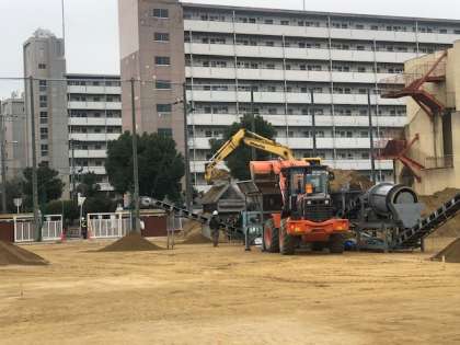 グランドは土を削ったあと、ふるいにかけられた土を入れています。また、庭のベンチを管理作業員のお二人が改修作業の準備をしています。