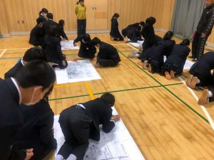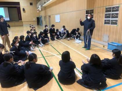 5限と6限に体育館で、住之江区役所の防災担当の方4名にお越しいただいて、防災教室を実施しました。実際災害時に役に立つ知恵をたくさん教えていただきました。