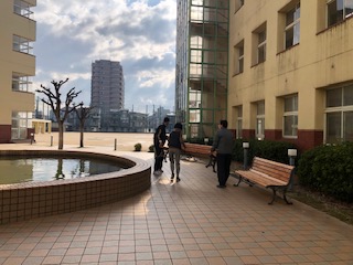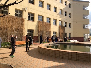 校長先生の一声で、職員全員が協力して中庭にベンチを運びました。大変気持ちの良い朝です。