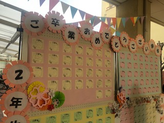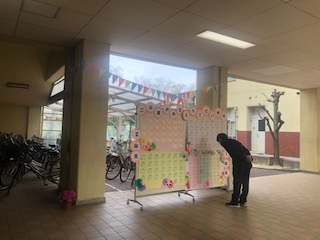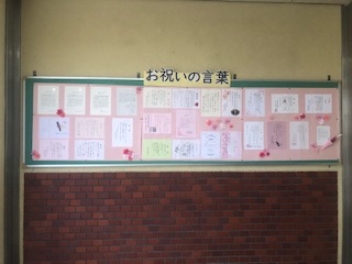 体育館前のピロティでは、1・2年生からのメッセージと、お祝いの言葉を掲示しています。